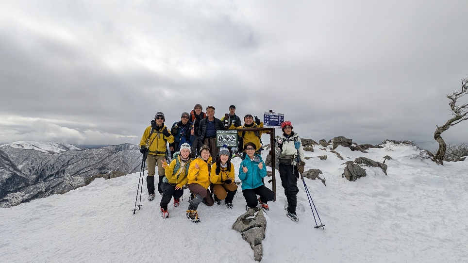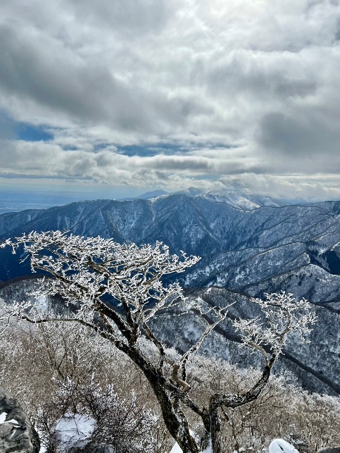 天気予報では爆発的に良い天気とされていたが、灰色の空が広がっていた。しかし、途中朝日に輝く伊勢湾や、山頂に近づくにつれ徐々に青空が見られ始め、雲間から覗く青い空は一段と美しく感じられた。また雪も深くなっていき雪と雲の白さと空の青さに包まれる雪山登山の醍醐味を感じた。途中藤原山荘で昼食をとる予定であったが、山頂付近は晴れて風もなかったため、山頂で素晴らしい景色を見ながら昼食をとることとなった。山頂では美しい樹氷、遠目には恵那山、御嶽山、雲に隠れながらも中央アルプスや北アルプスを望むことができた。