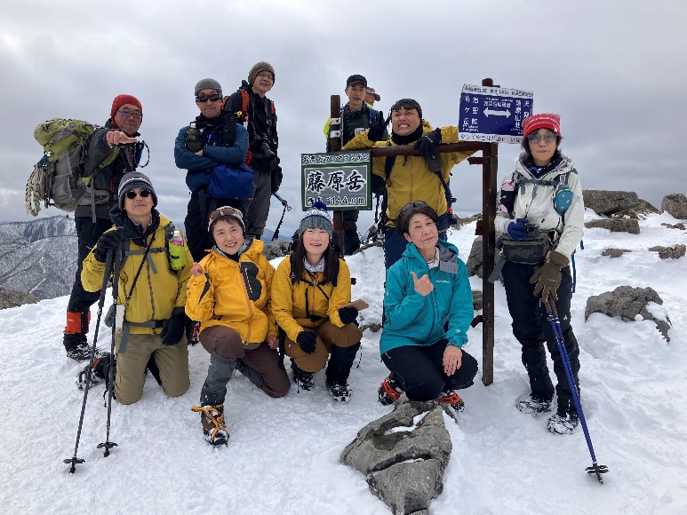 2026年の平日山行は藤原岳での幕開けとなった。企画者が参加できず残念であったが、お試し参加の方も加わり元気いっぱいのスタートとなった。前日の降雪に期待したが、期待ほど降らずワカン、ピッケルは車内に残し、アイゼン、チェーンスパを持って登った。稜線に出るまで登り一辺倒で少しハードだったが、2合目から立っている標札を目安にゆっくりと登った。登り始めは全く雪がなかったが徐々に雪が見られるようになり、7合目でアイゼンまたはチェーンスパを装着した。徐々に雪深くなっていき、途中からチェーンスパでは登りにくかったようだ。9合目の標札を見てあともう少しとの期待は見事に裏切られ、山頂までは3合分登ったかのように感じ、「9合目の嘘つき!」と思わず叫ぶメンバーもいた。