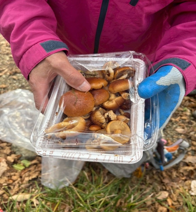 途中、なめこ採りの風景もありました。とても小さな山名板がある三人山を通過し、アップダウンを繰り返し東雨乞岳に向かいました。途中雪の残りの風景もありました。