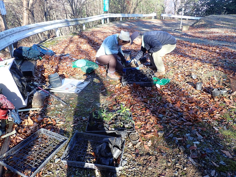 作業内容は、現地において「どんぐりの実」の植付作業(昨年とは植付場所を変え芽がより出そうな所に植付けを行った)、防獣ネット等の回収、のぼり旗の撤去などを実施。